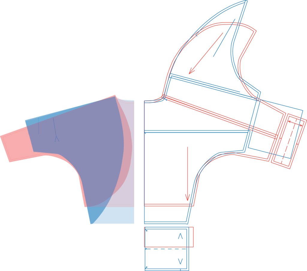Below is a superimposed comparison of the cardigan patterns: BL Dolman Cardigan (blue), BL Bolero (pink), and my altered KeiMade Cardi (black).