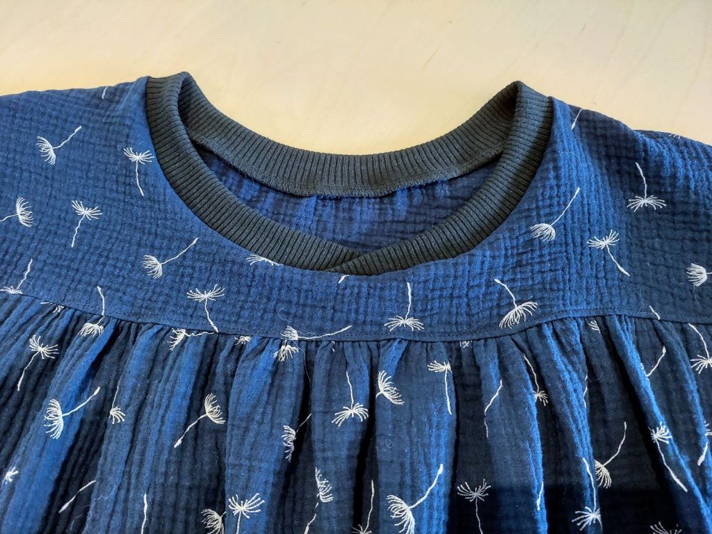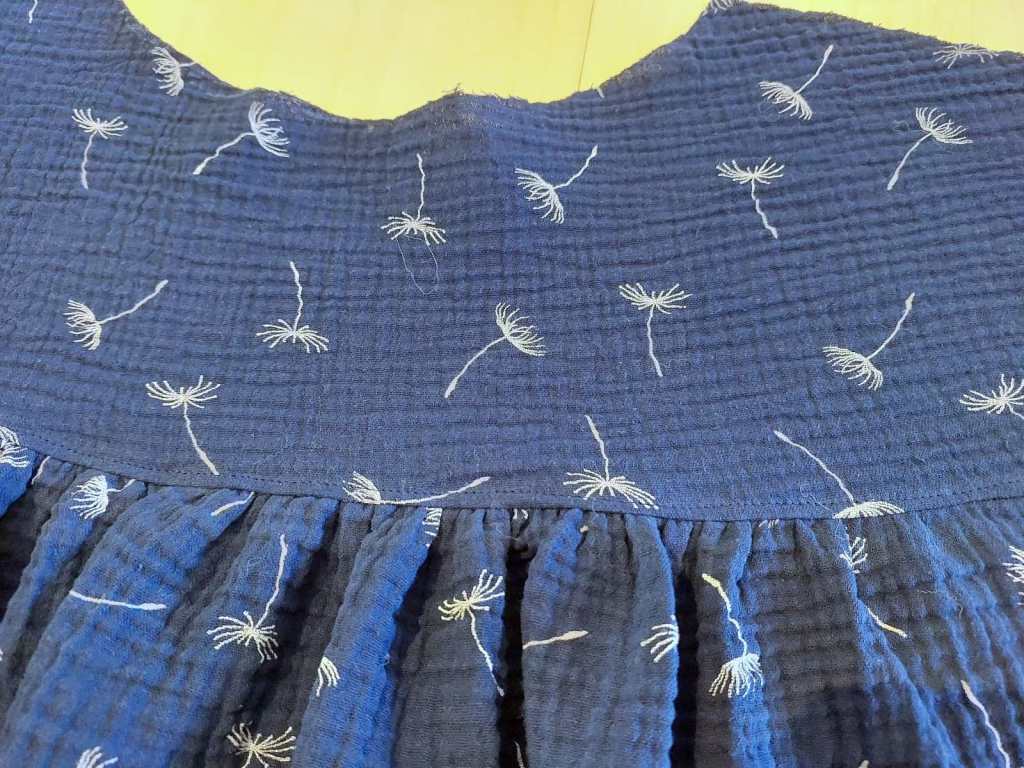 Gather the skirt panels so the skirt width matches the yoke width. Keep about 10cm on both sides un-gathered.