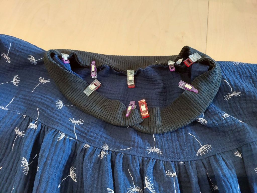 Iron the ribbing in half, and clip it along the neckline. Serge the neckline, and give it a top stitch.