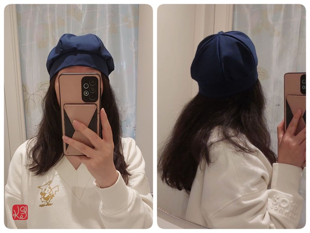 The gathers on this beret style hat makes it stylish. When worn deep, it looks like a cute occupational hat (like a baker’s hat, mini chef’s hat, scrub hat).