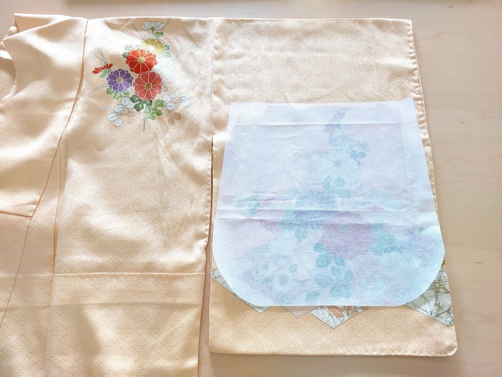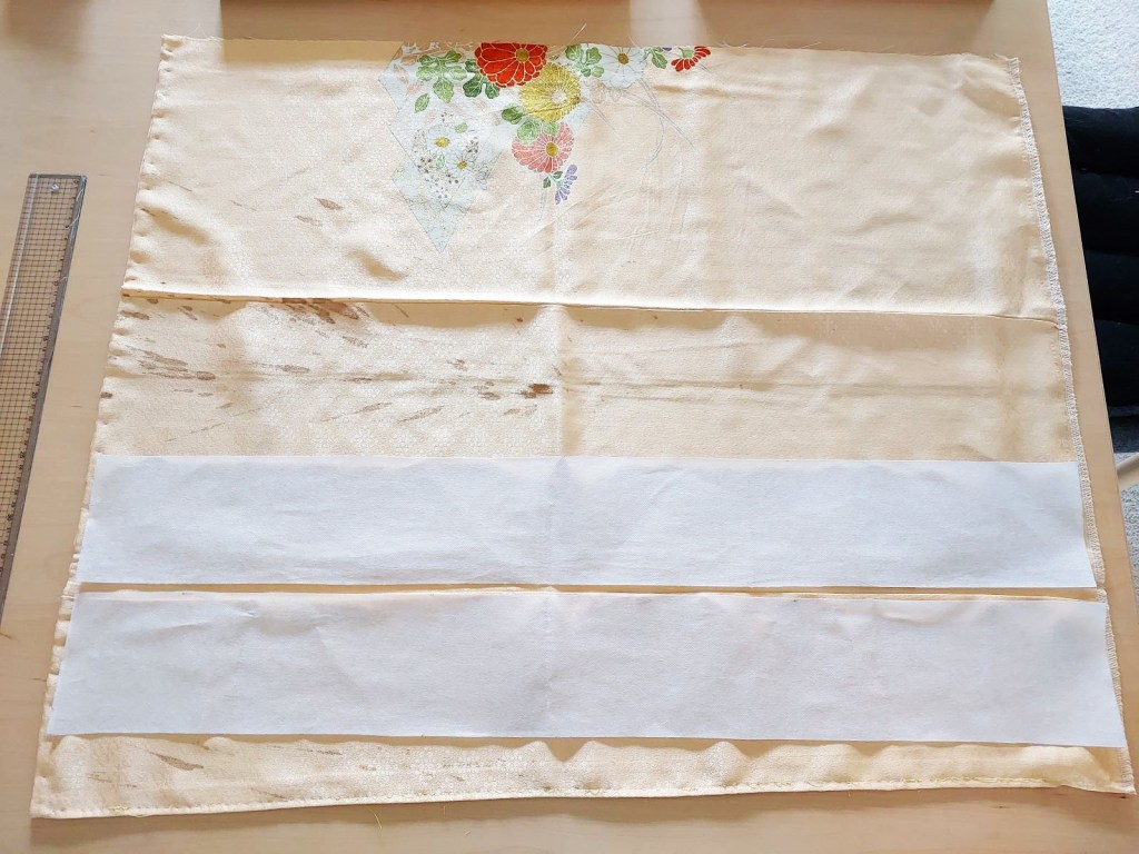 This kimono sleeve was 32cm from edge to edge. I wanted to utilise its whole width, so I undid all the stitching to isolate the sleeve’s outer fabric. The interfacing fabric was ironed the back of where I wanted the pattern to appear (bottom heavy with a bit of space above the top red flower), then cut. One sleeve made both front and back bag panels.