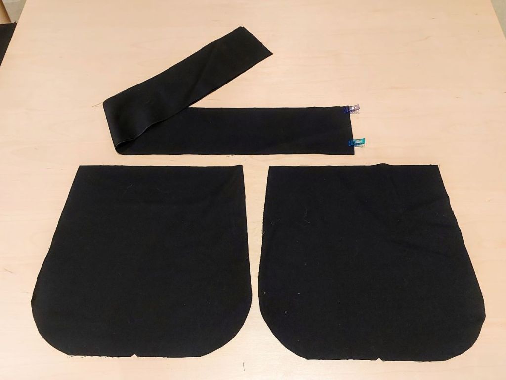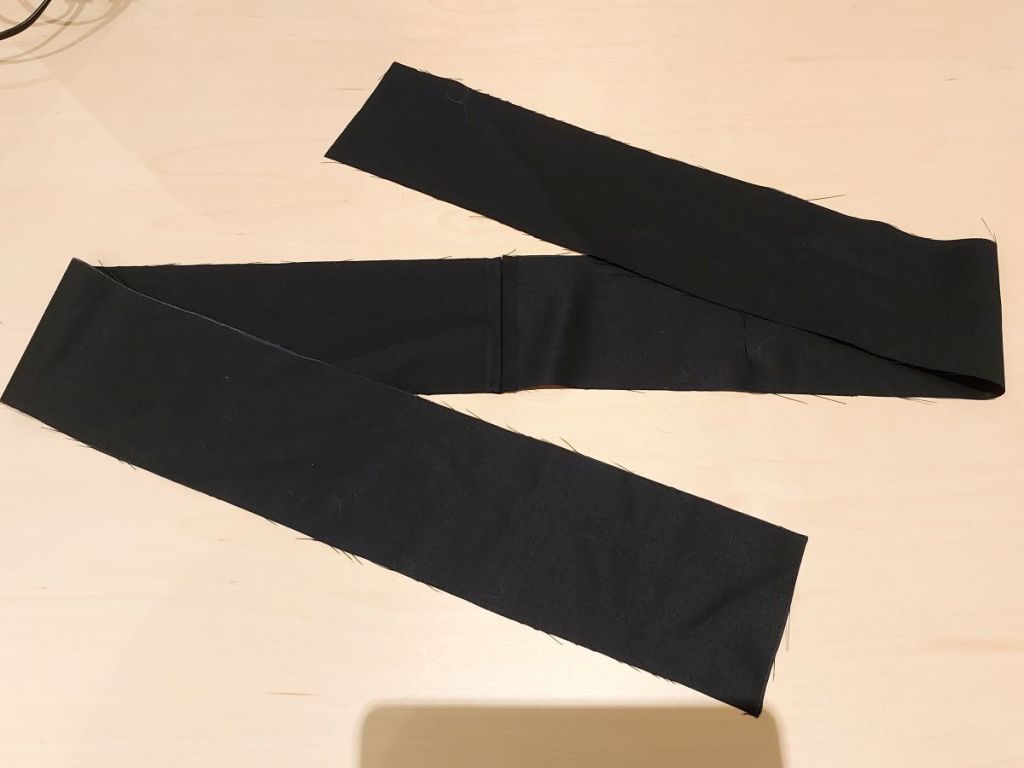 Firstly, the two long handle panels were sewn together, inside out along the short edge to make a long rectangular piece. The seams were flattened outwards, then sewn along them on each side to secure them.