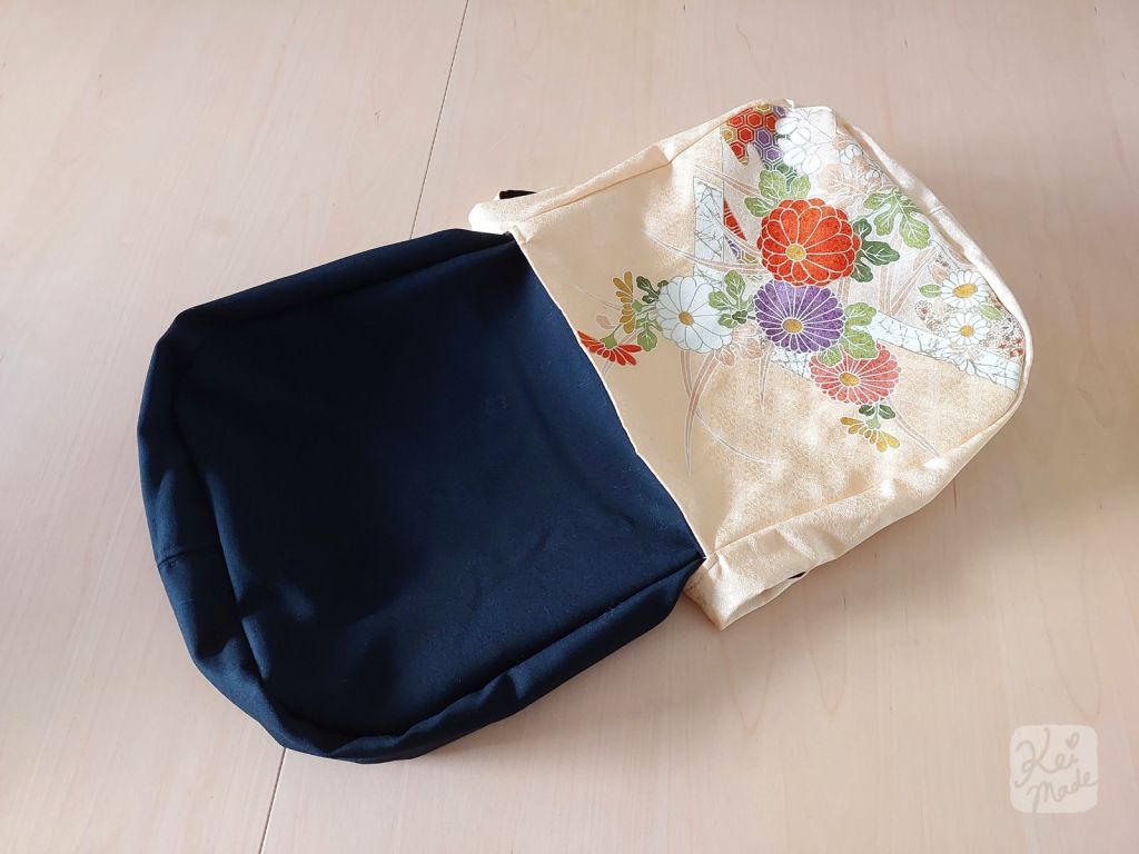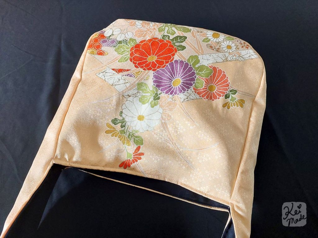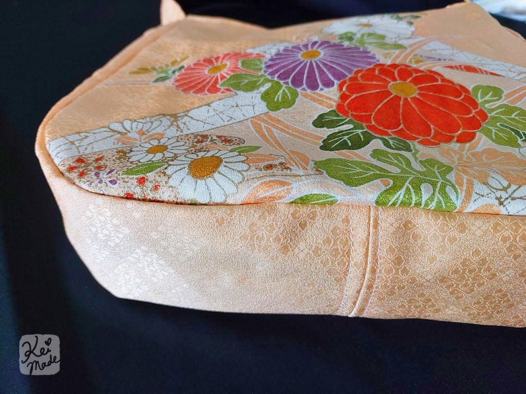 I wanted to utilise the beautiful vertical design on the sleeve. I found this bag style from Kokka Fabrics and used it as inspiration. I adjusted the sizing so it can be made from a sleeve of an unwanted kimono, and simplified it to have no inner pocket. The handle will be ~35cm (x2) long above the top of the bag.