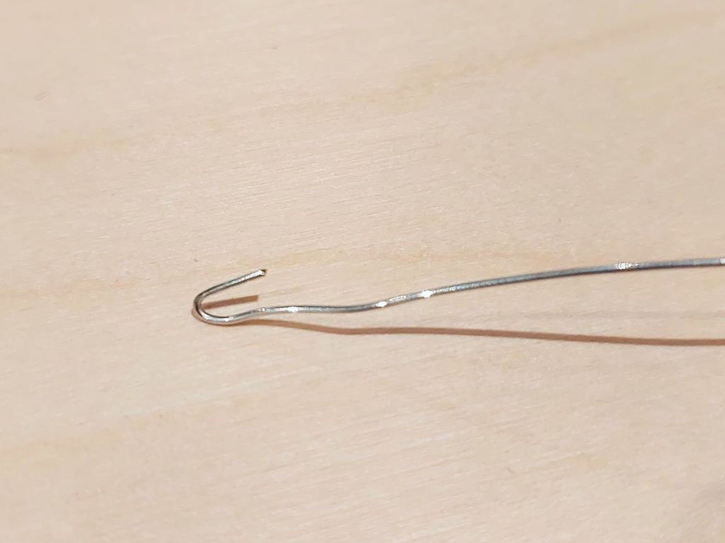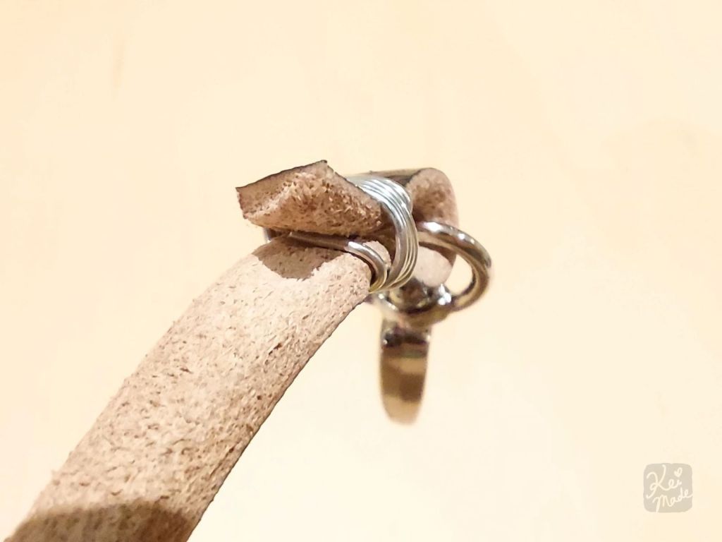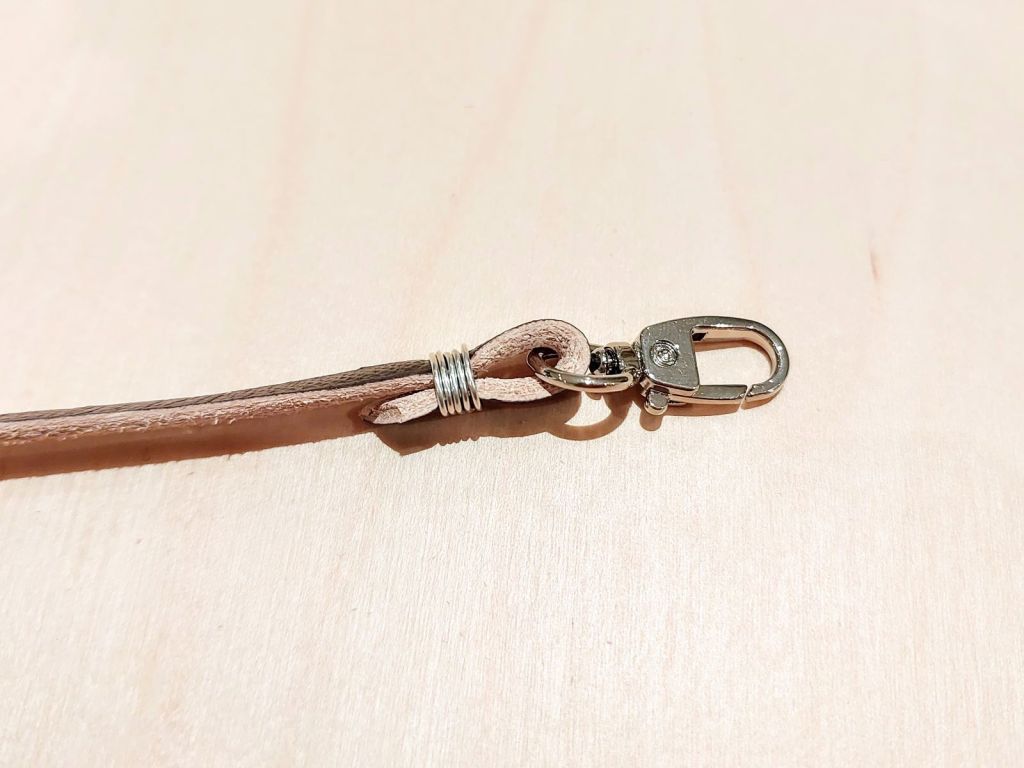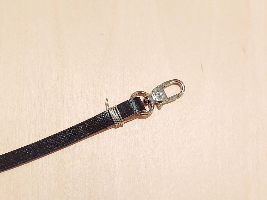 Insert one end of the leather strap into the eye of the hook, and fold it over 2.5cm.