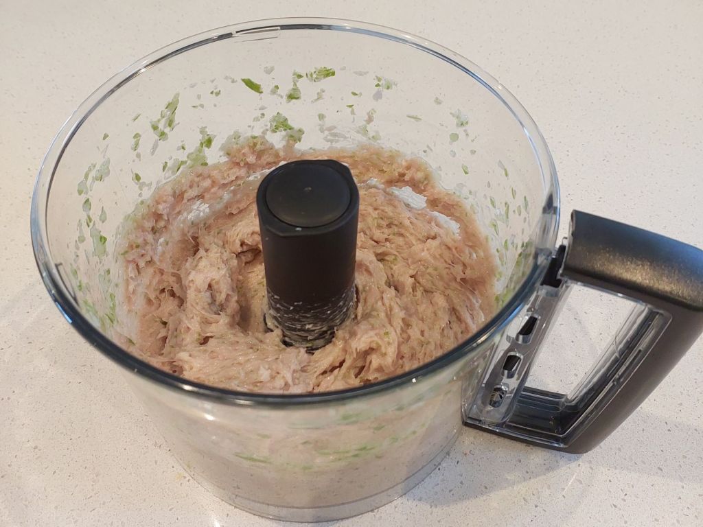 If making from thigh fillets, throw all the meatball ingredients into a food processor and whiz away until it becomes a pate. Proceed to step 3.